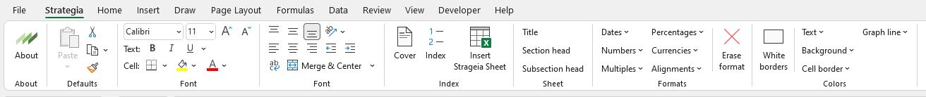 Cet Add-on (complément), créé pour l’entreprise Strategia Partners, permet aux utilisateurs de rapidement mettre en forme leurs fichiers Excel pour respecter la charte graphique de leur entreprise. Il y a pour cela un nouvel onglet